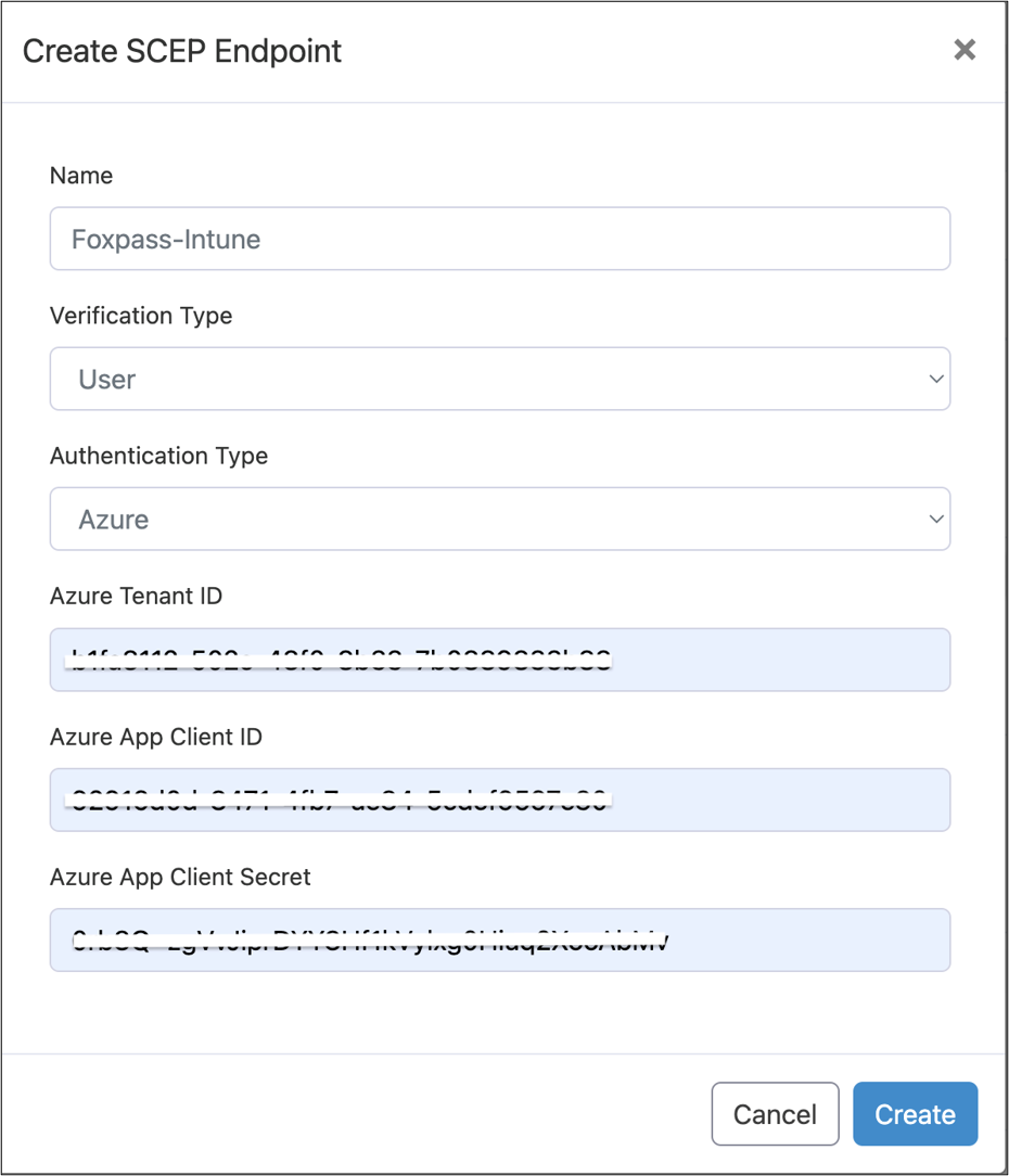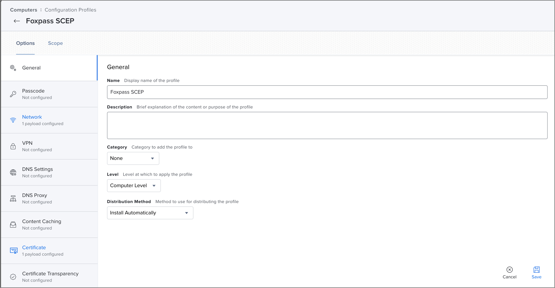 - SCEP Server URL - Foxpass コンソールの SCEP ページから一意のエンドポイント URL をコピーします