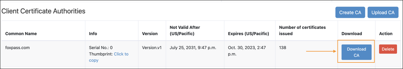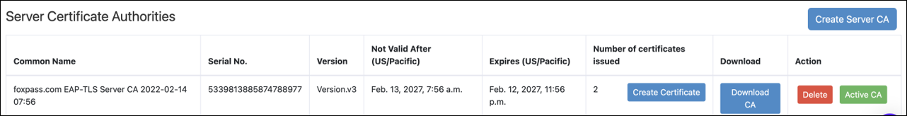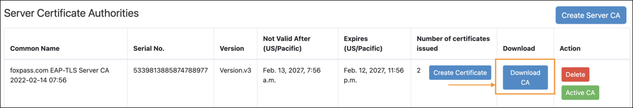 - FoxpassコンソールのEAP-TLSページの[Server Certificate Authorities]セクションから、クライアント認証局とアクティブなサーバーCAの両方から[Download CA]をクリックします
