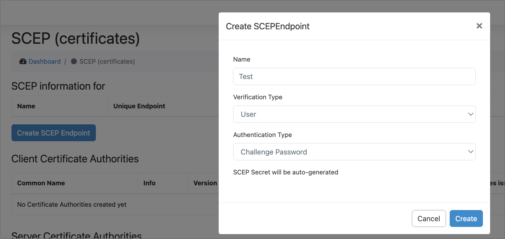 - SCEPページで 「SCEP エンドポイントの作成」 ボタンをクリックします。
