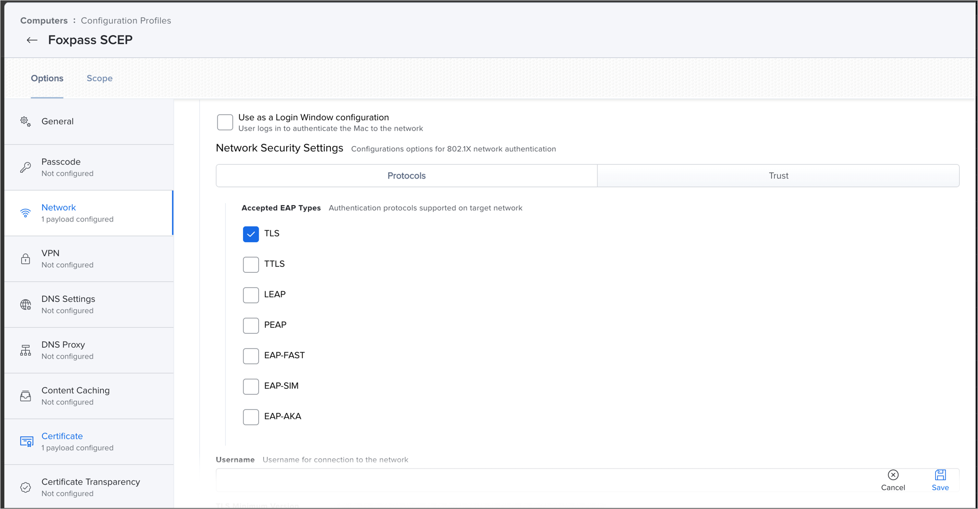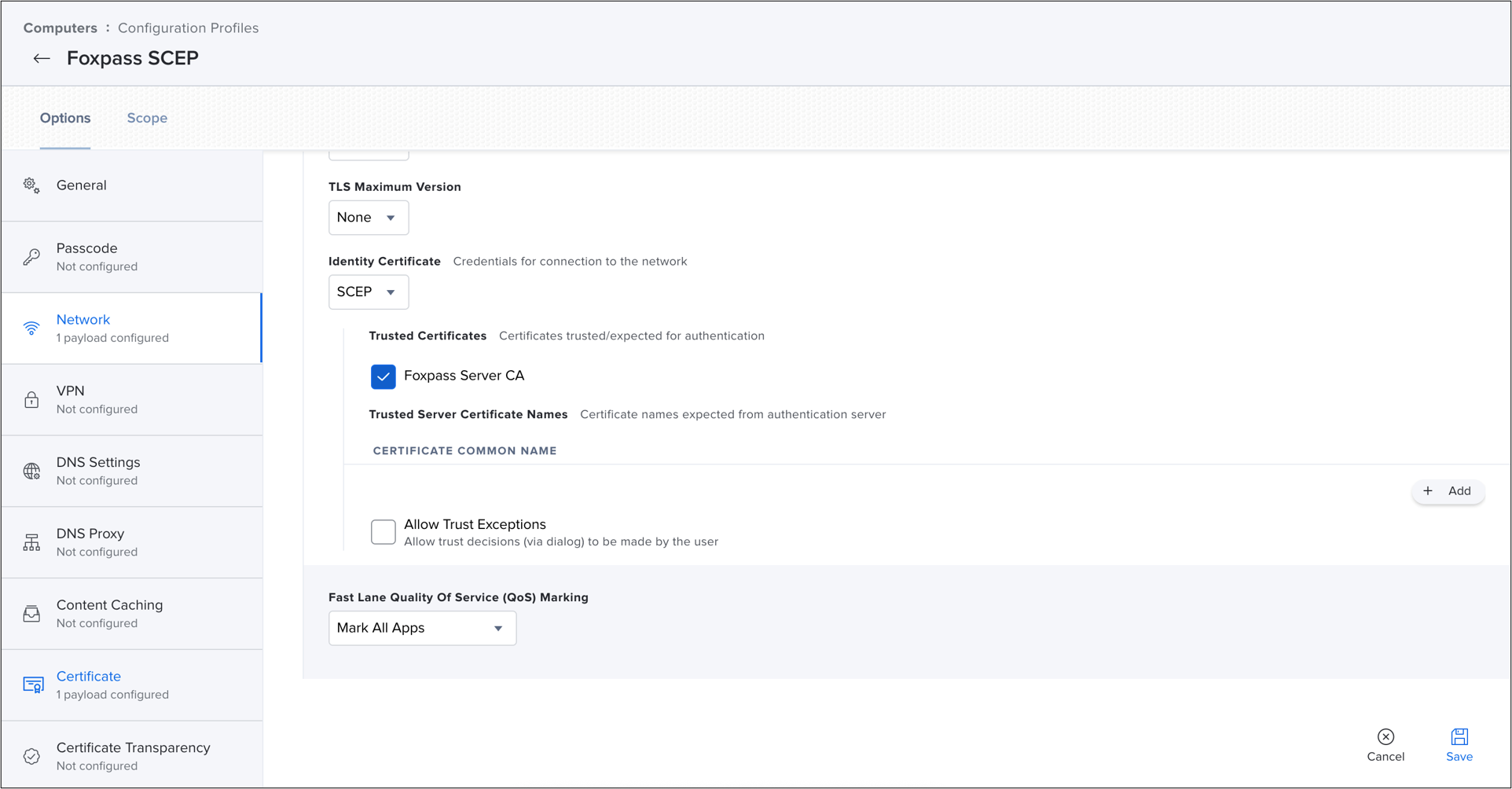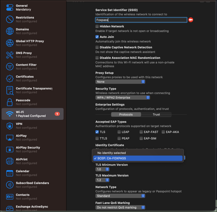[Trust] セクションの [Trusted Certificate] で、Foxpass サーバー CA をアップロードします。Identity certificate > の場合は、SCEP Profile を使用します。WiFi プロファイルで、SCEP 証明書を ID 証明書として使用します。[Trust] セクションで、サーバー証明書をアップロードします。