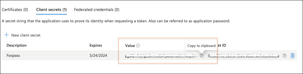 - アプリの「Certificates & secrets」セクションに移動し、「Client secrets」で「New client secret」ボタンをクリックします。シークレット値をコピーします - これはクライアントのシークレットです。注 - シークレット ID ではなく、シークレット値を必ずコピーしてください。