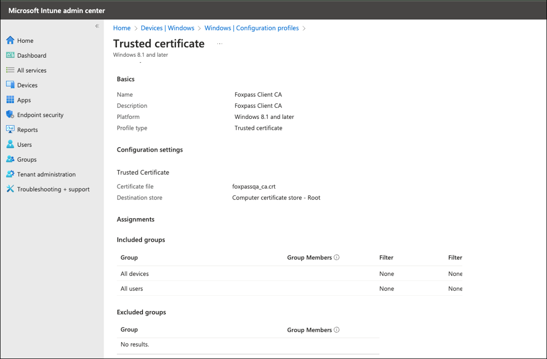 - 信頼された証明書テンプレートを使用して、Windows 10 用の新しいプロファイルを作成します。Foxpass Server CA 証明書をサーバープロファイルにアップロードします。(CA をダウンロードするには、EAP-TLS の [Server Certificate Authorities] の下にある [Active CA] セクションの [Download CA] ボタンをクリックします。サーバー CA のダウンロード場所については、以下の画像を参照してください。