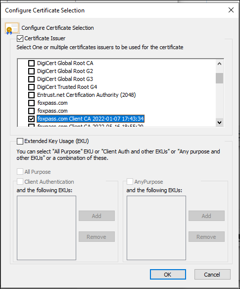 - Certificate Authority - 以前に設定した「FoxpassクライアントCA」を選択します