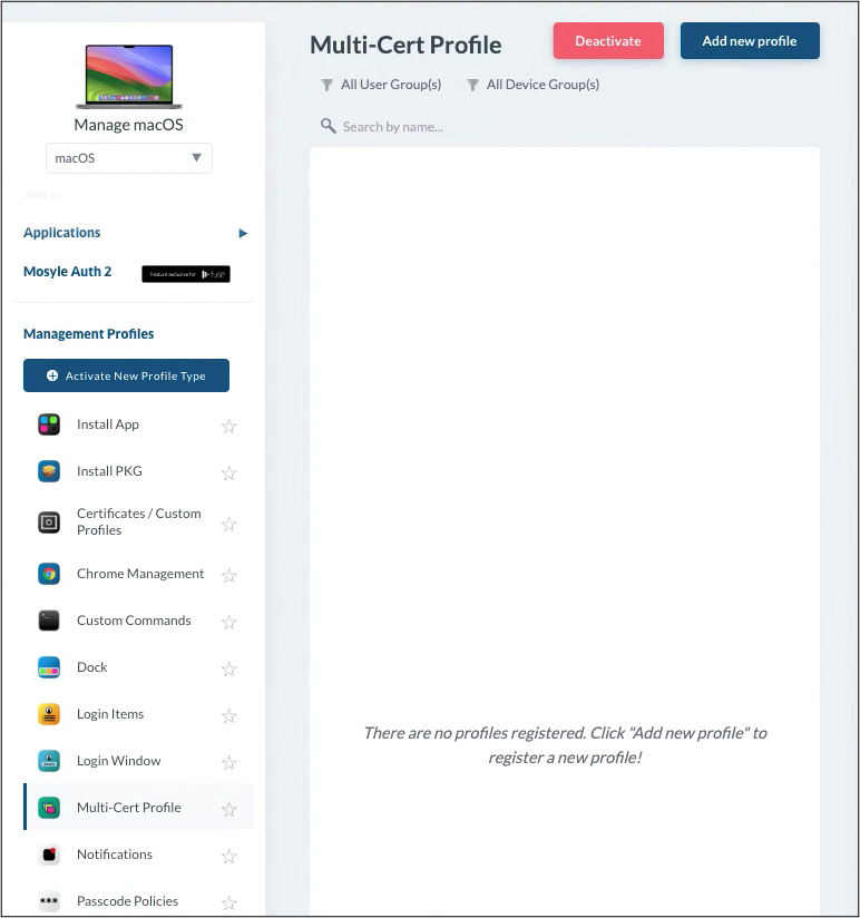 Mosyle の場合は、マルチ証明書プロファイル機能を使用します。有効にするには、[Management] > [Activate New Profile Type] > [Multi-Cert Profile] > [ Activate] に移動します。有効にしたら、「Add new profile」を選択できます。