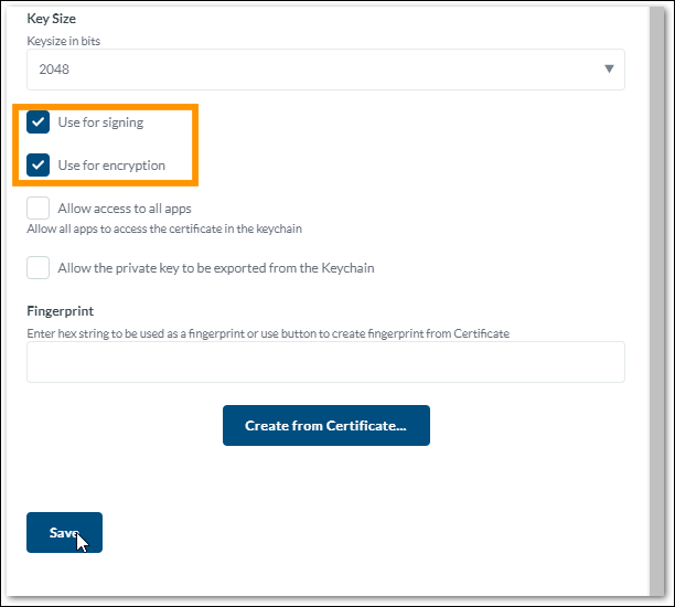 - キーサイズは 2048 です。「Use for signing」と「'Use for Encryption」の両方にチェックを入れます。