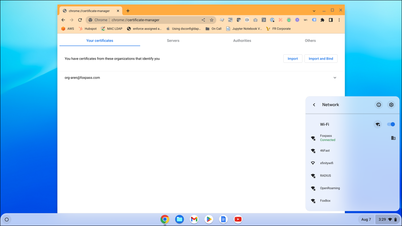 - Google Workspace の [Networks] > [Certificates] でクライアント CA を追加します。[Add Certificate] をクリックします。「Foxpass Client CA」という名前を付けます。「Upload」をクリックします。先ほどダウンロードしたクライアント CA をアップロードします。[Add] をクリックします。
